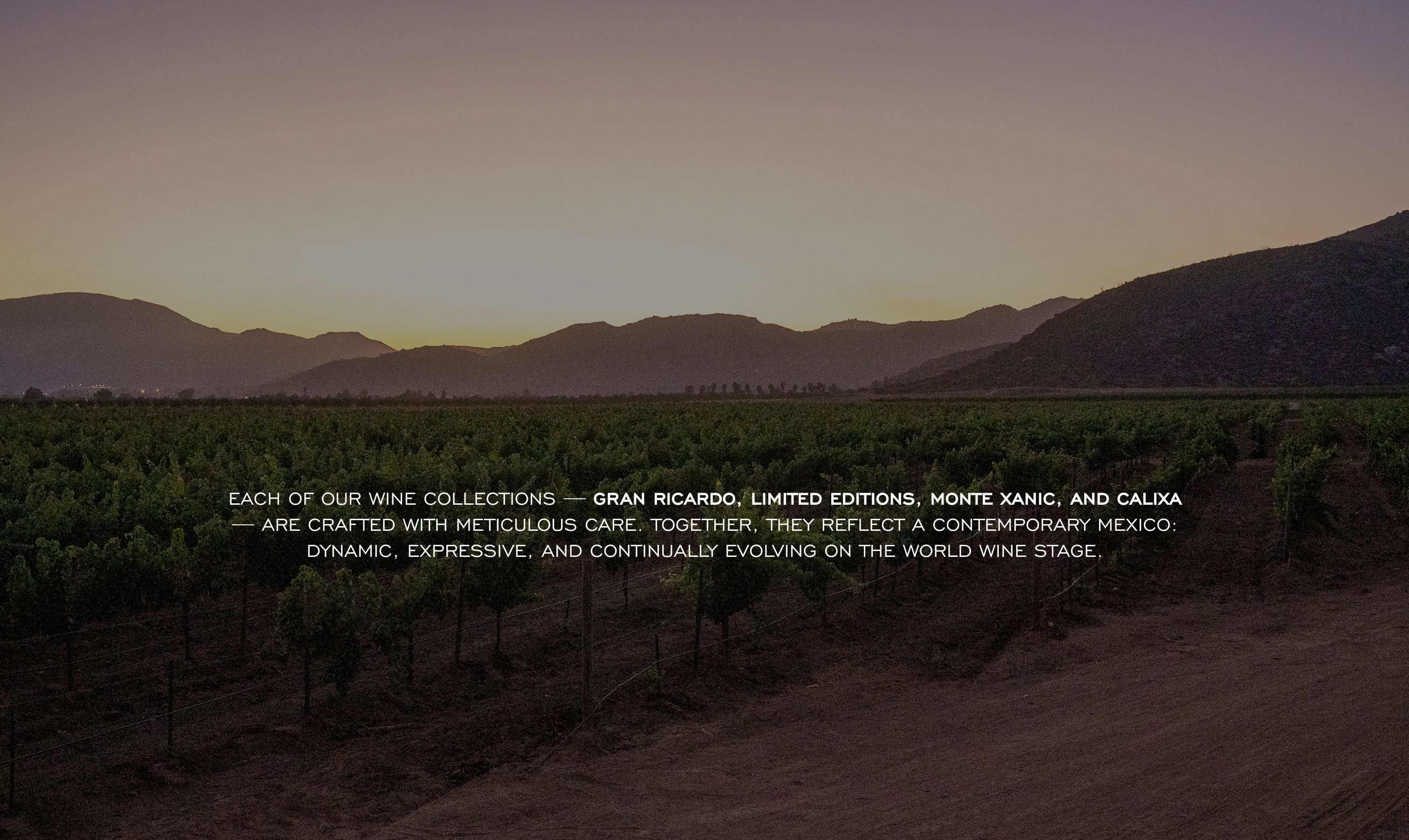 Authentic wines from Baja California that express our estate’s winery identity. Influenced by Mediterranean conditions and diverse soils, these wines achieve optimal ripeness and aromatic clarity, showcasing fruit-forward profiles with floral and complex nuances.